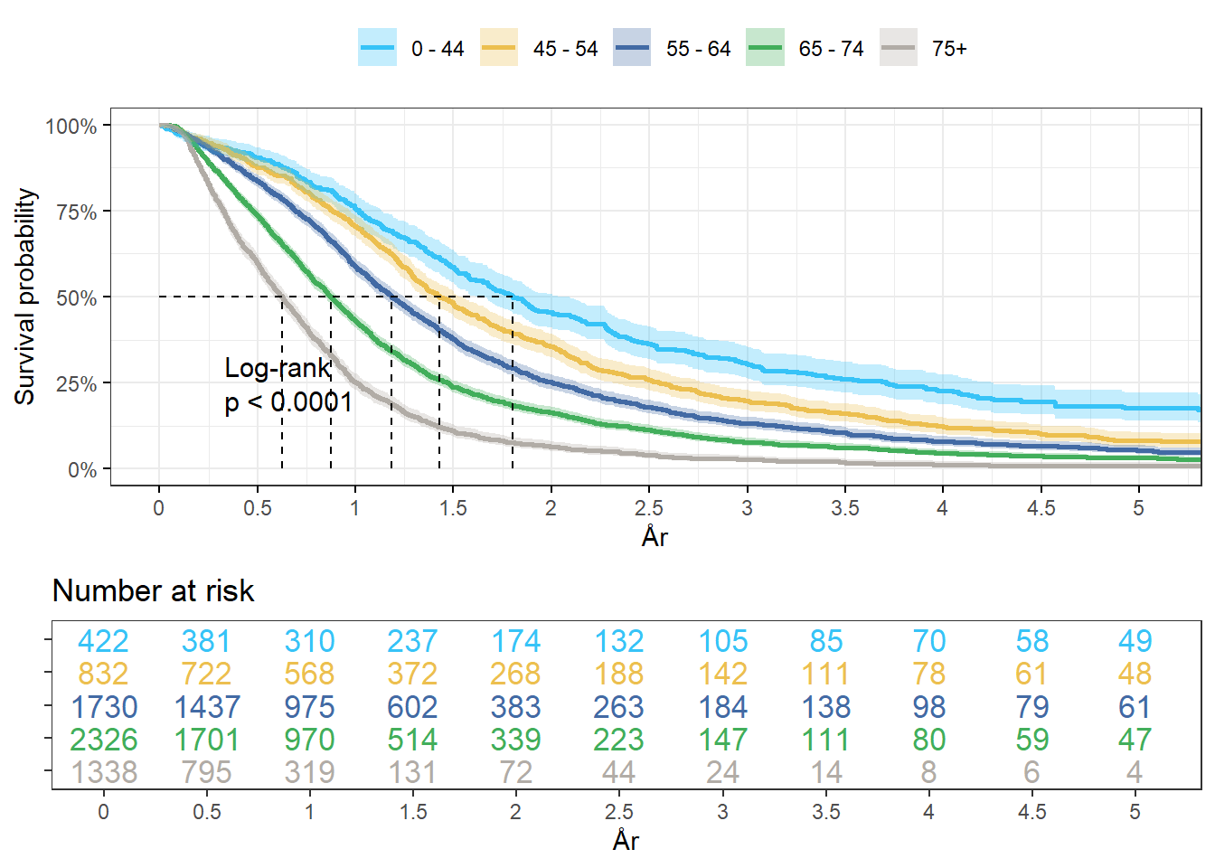 Det finns som förväntat från litteraturen skillnader i överlevnad vid glioblastom i olika åldersgrupper. Dessa skillnader är statistiskt signifikanta (säkerställda). I årets beräkningar kan konstateras att 8,2 % av patienterna i åldersgruppen 45-54 år var vid liv fem år efter diagnos tabell 1 vilket är en minskning jämfört med 9,3 % i 2021 års kortrapport men en ökning från 8,0% i förra årets rapport. I den äldsta åldersgruppen (patienter äldre än 75 år vid diagnos) var 0,7 % av patienterna vid liv fem år efter diagnos 2021 jämfört med 0,9 % vid årets och fjolårets beräkningar.