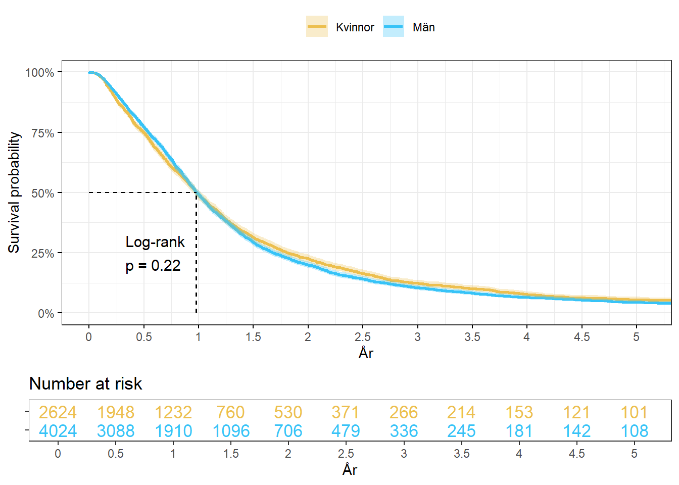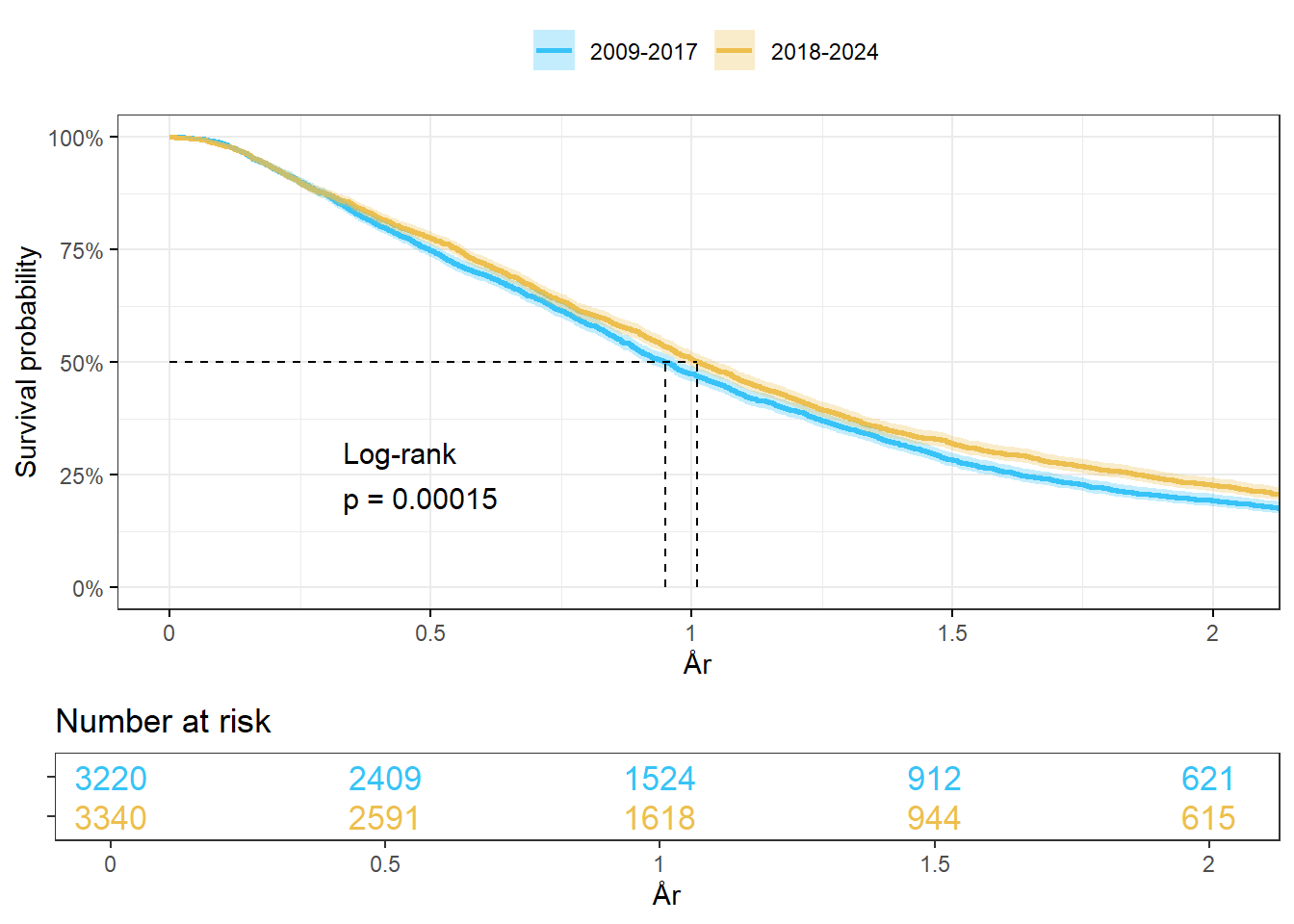 Trots att det är små skillnader mellan perioderna så är skillnaden i medianöverlevnad mellan perioden 2009-2017 och perioden 2018-2024 statistiskt signifikant. Det innebär att gruppen patienter som diagnostiserats 2018 och senare lever nästan en månad längre än de diagnosticerade före 2018. Det är viktigt att notera att överlevnadsjämförelsen inte är korrigerad för andra faktorer som kan spela roll för överlevnaden.